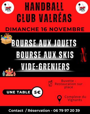 Le hanb-ball club de valréas vous propose sa bourse aux jouets, bourse aux skis et vide armoire annuelle à l'intérieur !