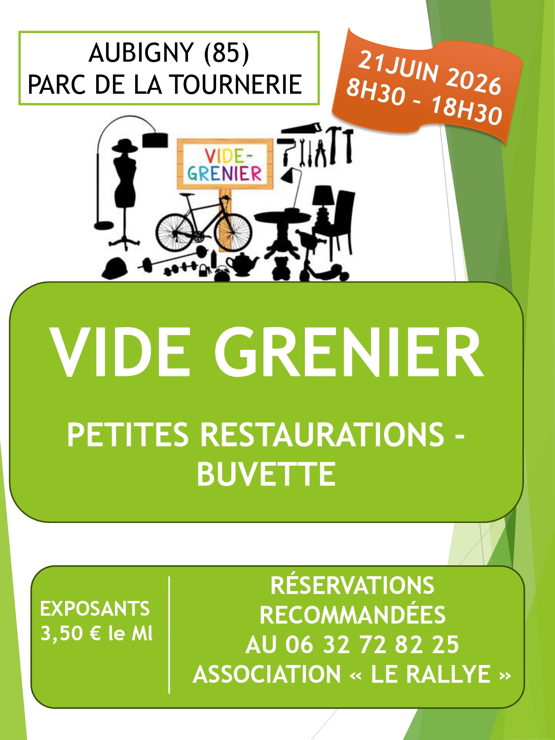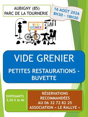 Après un franc succès en 2025, nous recommençons l'opération cette année. Le parc de la tournerie à aubigny est un lieu très agréable pour se balader en pleine nature et venir "chiner" lors de vide-greniers. Des grillades/frites accompagnées de boissons seront servies sur place pour combler un petit creux. Venez participer à cette journée décontractée et dans la bonne humeur.
