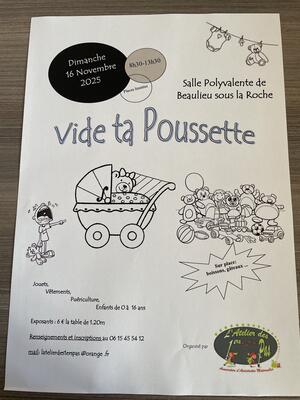 L’ association d’assistante maternelle organise le dimanche 16 novembre 2025 à la salle polyvalente de beaulieu sous la roche un vide ta poussette de 8h30 à 13h30. Vente de jouets, vêtements et matériel de puériculture. Venez nombreux avec ou sans poussette !