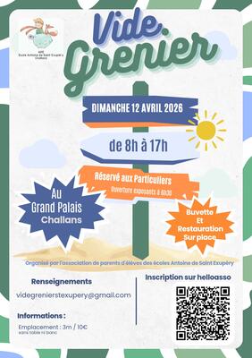 Rendez-vous pour notre vide-grenier dimanche 12 avril 2026 de 8h à 17h au grand palais – challans