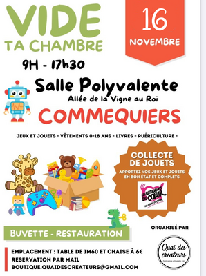 Le samedi 15 novembre 2025, venez profiter du vide ta chambre organisé par l'association quai des créateurs, dans la salle polyvalente de commequiers (85) . Vous pourrez y vendre jeux et jouets - vêtements 0-18 ans - livres - puériculture -