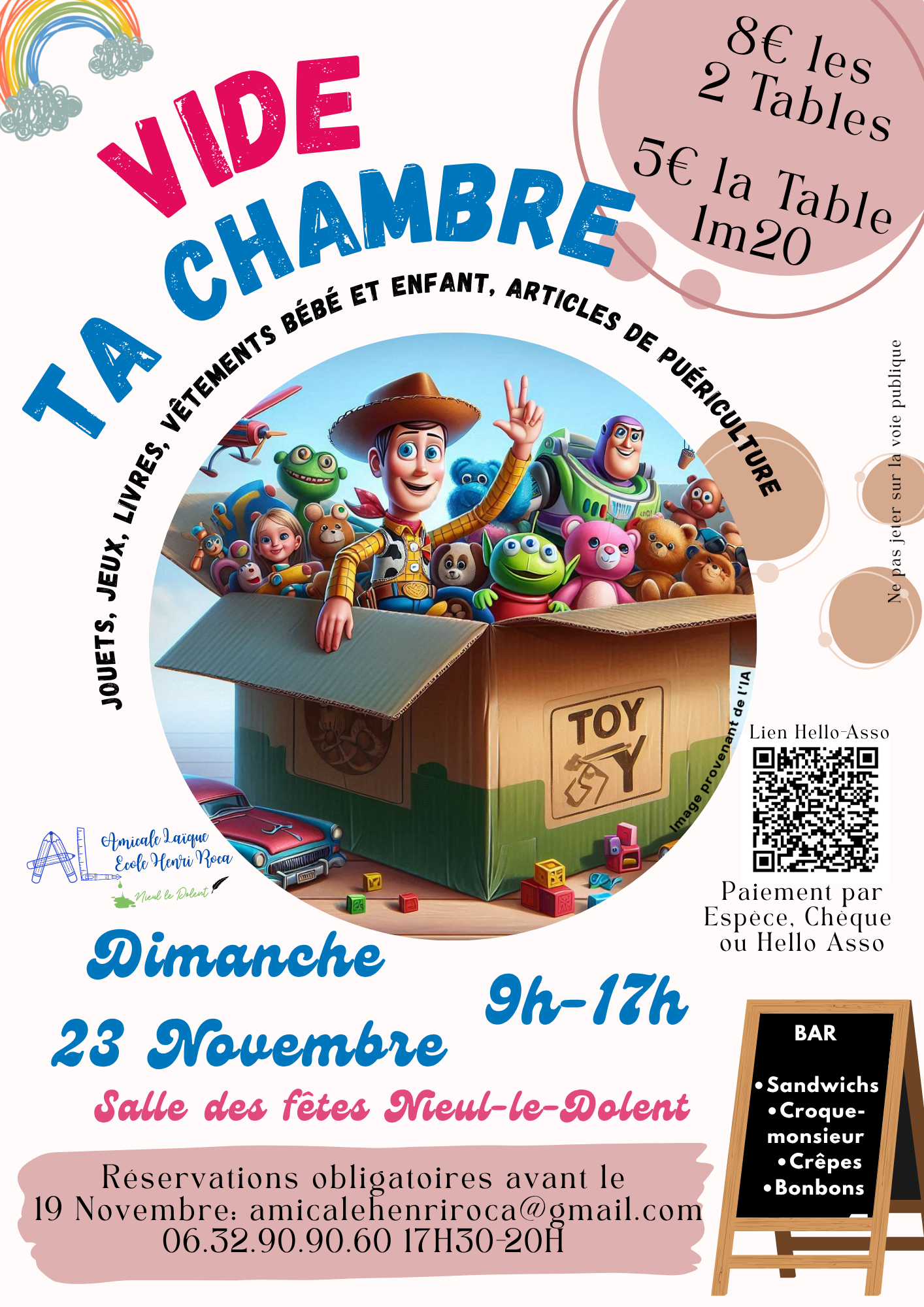 L’amicale laïque organise la 4ᵉ édition du “vide ta chambre” le dimanche 23 novembre, de 9 h à 17 h, à la salle des fêtes de nieul-le-dolent.
