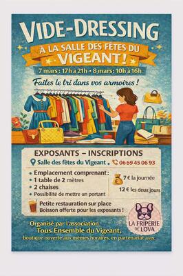 Organise par l'association tous ensemble et la friperie de love, on vous propose un vide dressing sur 1 weekend a l'intérieur.
