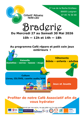 Grande braderie – ne manquez pas les bonnes affaires ! Venez profiter de notre braderie et faites le plein de bonnes affaires ! Date : du 27, 28, 29 et 30 mai 2026 lieu : collectif mélusine horaires : 10h - 12h et 14h - 18h prix au kilo ! Vêtements, accessoires, déco, vaisselles ! Ambiance conviviale, stands variés et surprises vous attendent tout au long de la journée. Venez chiner, découvrir et faire de belles trouvailles à petits prix ! Partagez l’événement avec vos amis et venez nombreux ! Pour plus de renseignements, n'hésitez pas à nous contacter , par mail ou sur site au jour d'ouverture de la ressourcerie mercredi, vendredi et samedi de 10h - 12h et 14h - 18h30 collectif mélusine