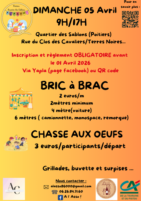 Venez exposer vos merveilles à poitiers, quartier des sablons (attention mètres linéaires limités). Pour les plus jeunes, différentes activités (pêche à la ligne, balade en poney...) viendront animer l'après-midi. Et pour les gourmands, petite restauration sur place.