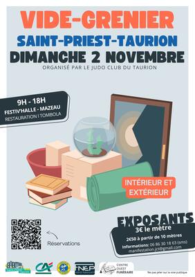 Le judo club du taurion organise son grand vide-grenier couvert le dimanche 2 novembre ! Festiv’halle – le mazeau – saint-priest-taurion - intérieur, préau, extérieur - buvette & restauration - tombola renseignements venez chiner ou vendre et passez un bon moment tout en soutenant le club et ses judokas !