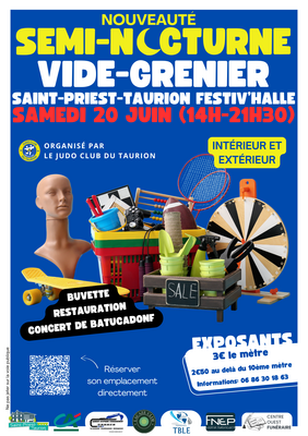 Participez au vide-grenier semi-nocturne du judo club du taurion le samedi 20 juin 2026 à la festiv’halle de saint-priest-taurion.
