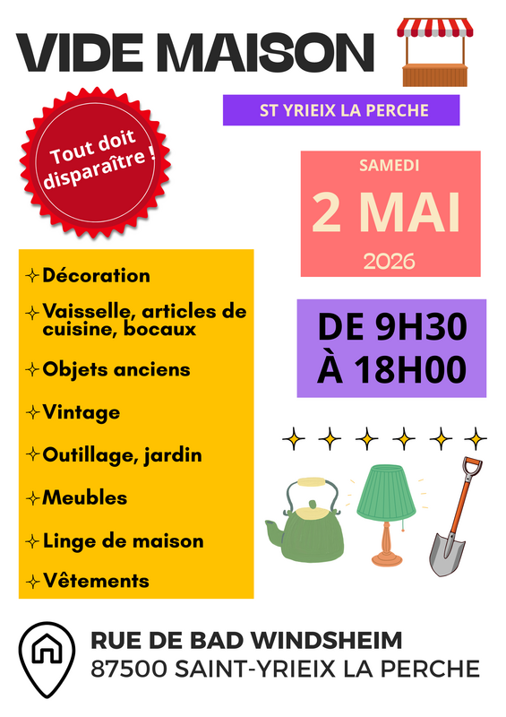 Décoration, vaisselle, articles de cuisine, bocaux, objets anciens et vintage, outillage, jardin, meubles, linge de maison, vêtements.