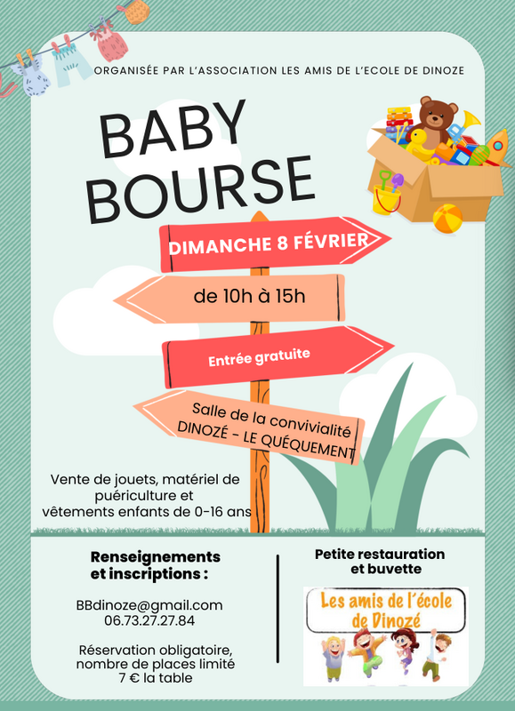 L'association des amis de l'école de dinozé organise sa baby bourse annuelle : vente de vêtements enfants, articles de puériculture, jouets.