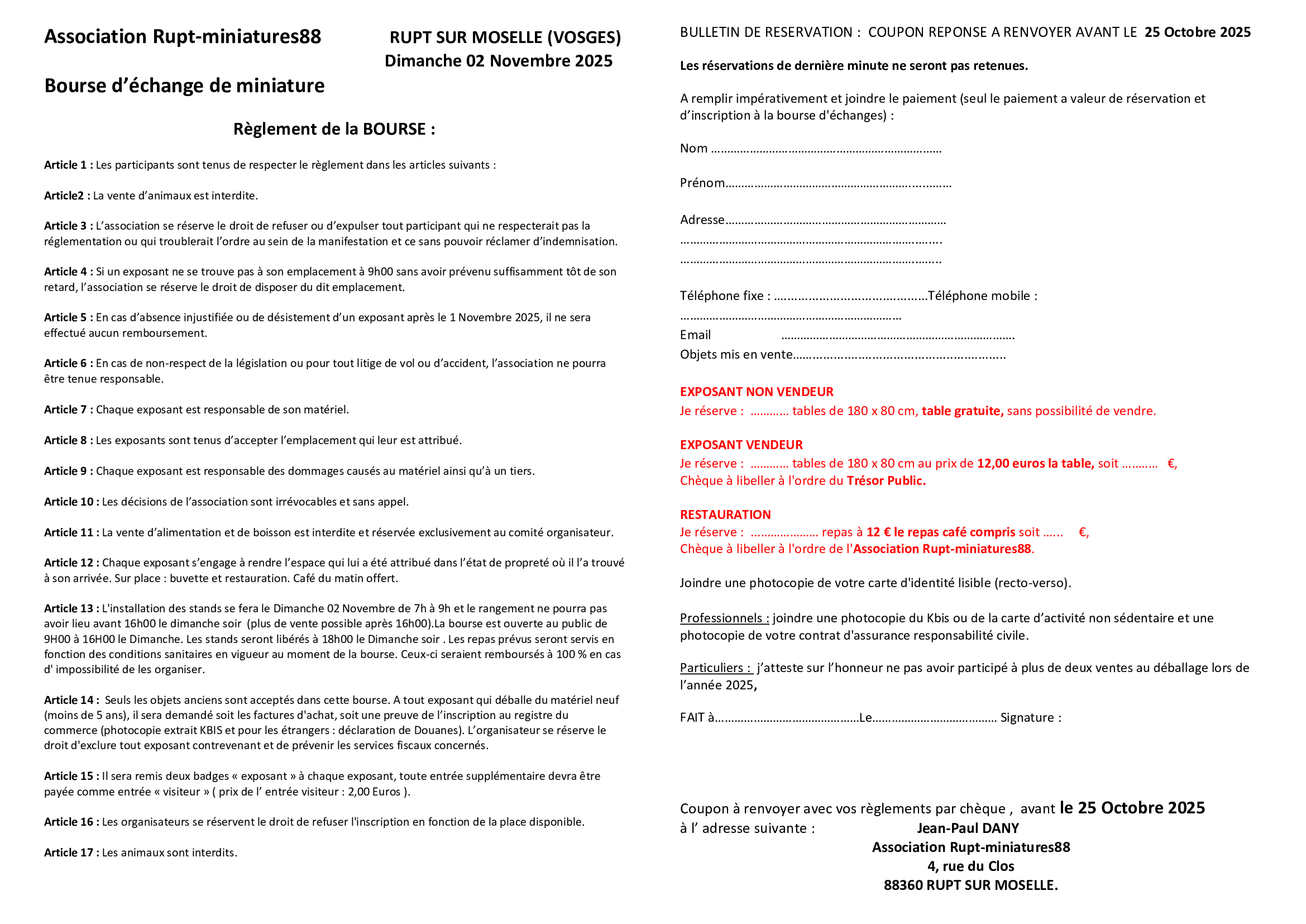 Bourse d’échange de miniatures et de modélisme (maquettes, modèles réduits, trains, camions, autos, figurines, jouets anciens et de collection, miniatures divers, expo de miniatures et autres, organisée par l'association rupt-miniatures88 le dimanche 02 novembre 2025 de 9h00 à 16h00 au gymnase municipal rue jules ferry à rupt sur moselle (88360) , situé à environ :