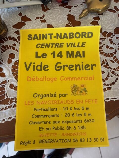 Les navoiriauds en fête organisent leur traditionnel vide grenier et déballage commercial le jeudi 14 mai (jour de l'ascension) au centre de st-nabord 88200, rue du général de gaulle, et autres, horaires visiteurs de 8h00 à 18h. Parkings et wc gratuits. L'association assure les animations, buvette et petite restauration, venez nombreux et passer une agréable journée, où vous pouvez trouver l'objet qu'il vous manque...