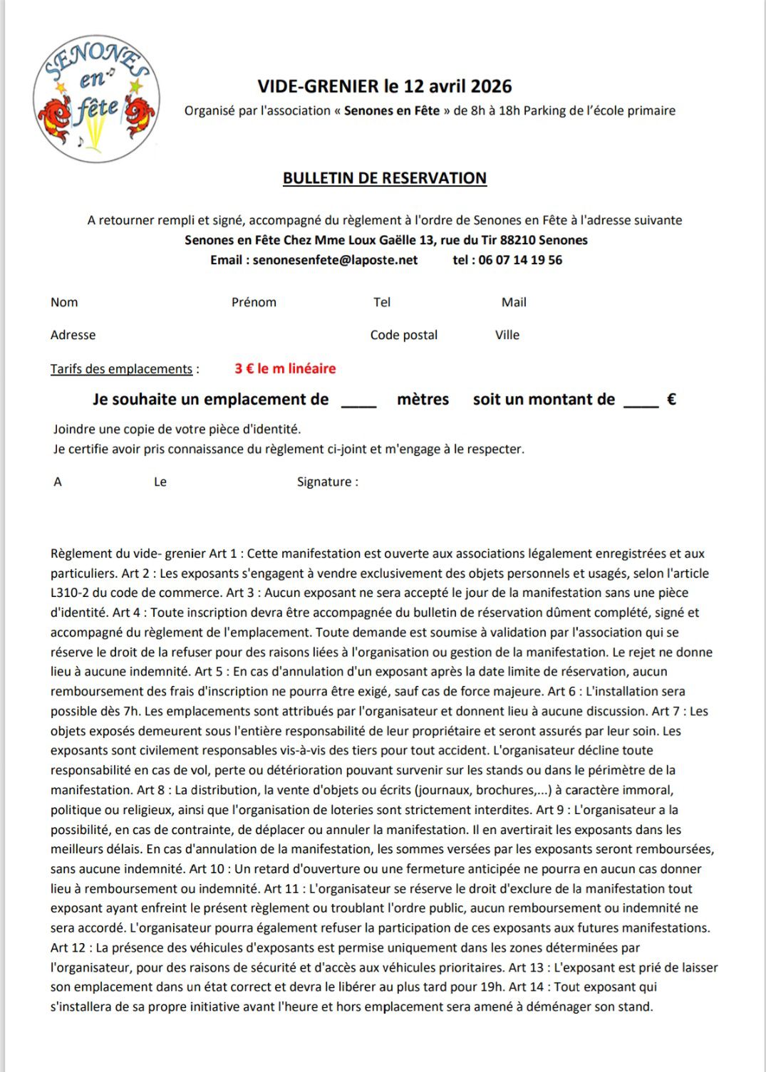 Bulletin d'inscription à remplir pour exposer et à renvoyer accompagné du règlement à l'adresse indiquée.