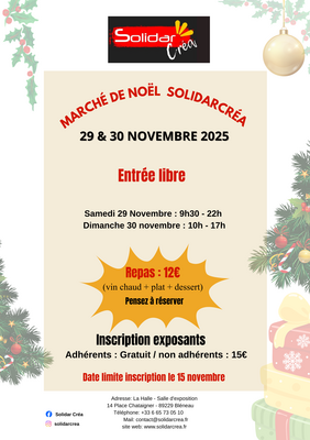 L'association solidarcréa a le plaisir de vous convier à son chaleureux et festif marché de noël 2025 ! Venez partager un moment convivial, dénicher des trésors et savourer l'esprit des fêtes.