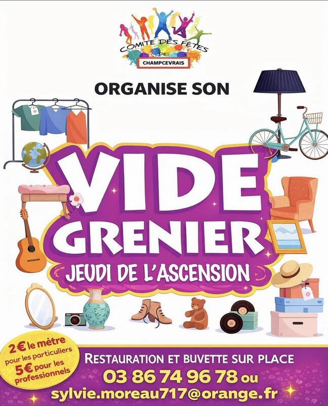 Venez nombreux à la brocante de champcevray ! Chaque année, elle s’agrandit. Elle se déroule dans le centre du village, mais n’hésitez pas à aller jusqu’au bout de la rue du pressoir, car plusieurs habitants s’installent devant chez eux.