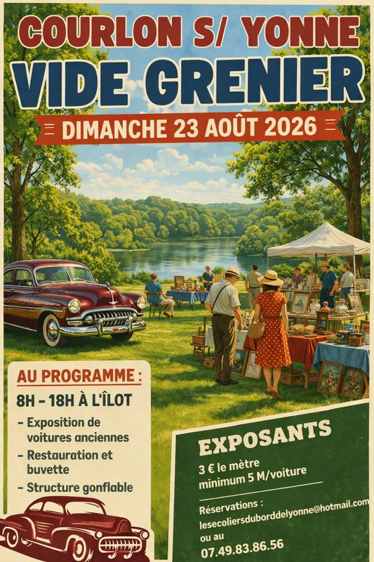 Vide grenier – courlon-sur-yonne dimanche 23 août 2026 à l’îlot – rue du port, courlon-sur-yonne de 8h à 18h les écoliers du bord de l’yonne vous invitent à venir profiter d’une journée conviviale au bord de l’eau venez chiner, vendre ou simplement vous promener dans un cadre agréable et familial au programme : exposition de voitures anciennes restauration & buvette sur place structure gonflable pour les enfants infos exposants : 3 € le mètre (minimum 5 mètres avec véhicule) emplacement dans un cadre verdoyant en bord d’yonne réservations une belle journée de partage, de bonnes affaires et de détente vous attend !
