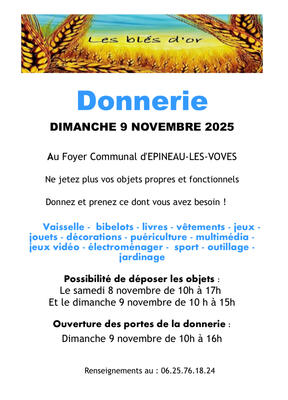 L’association « les blés d’or » organise le dimanche 9 novembre 2025 une donnerie au foyer communal d’epineau-les-voves (rue des près).