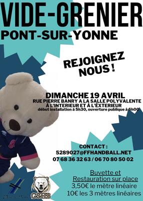 Pour sa second édition de son vide grenier le club de hand de pont-sur-yonne, vous accueille à partir de six heures. Buvette et restauration sur place.