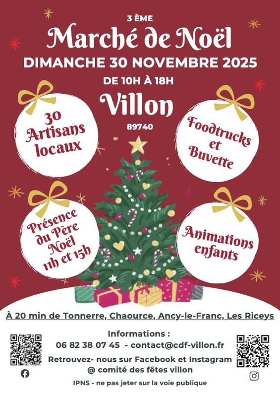 Venez partciiper au 3ème marché de noêl de villon, à 20 min de tonneree, des riceys , chaource et de ancy le franc ! Visistez nos exposants artisans locaux, et producteurs répartis dans la salle des fêtes et la cour de la mairie.