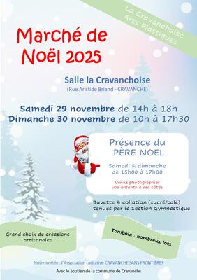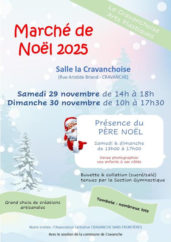 L'association la cravanchoise arts plastiques organise son traditionnel marché de noël à la salle de la cravanchoise samedi 29 novembre 2025 de 14h à 18h et dimanche 30 novembre de 10h à 17h30. Présence du père noël samedi et dimanche de 15 à 17h.