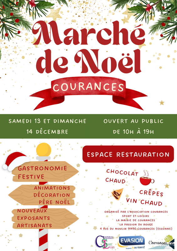 Marché de noël à courances : artisanat, gastronomie, décorations, présence du père noël, restauration sur place avec chocolat chaud, crêpes et vin chaud dans une ambiance festive et chaleureuse.
