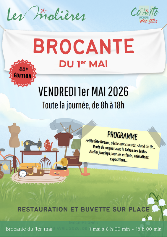 Venez vous balader dans cette magnifique brocante, vous y trouverez des satnds d'habits, d'antiquités, ventes de bonbons, vente de muguets.