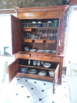 Dans la maison: meuble en merisier; vaisselier louis philippe + encoignure + guéridon, mange debout + 2 sièges, petit mobilier, miroir, sèche linge, ect.