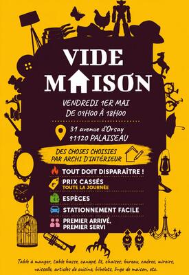 Vide-maison complet, vendredi 1er mai de 9h à 18h, 31 avenue d'orsay, 91120 palaiseau. Maison entièrement meublée par une architecte d'intérieur : lits + matelas, canapé velours, fauteuils, tables, chaises, vaisselier, tapis soie, luminaires sarah lavoine, télé samsung, barbecue weber gs4 genesis II, salon de jardin, machine à laver, sèche-linge, outillage (kärcher, bosch). Prix cassés toute la journée. Espèces uniquement. Pas de réservation, premier arrivé premier servi. Stationnement facile.