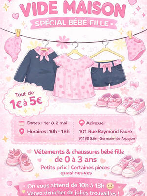 Bonjour j’ouvre les portes de chez moi le 1 et 2 mai de 10h à 18h pour vendre des vêtements filles qui va de l’âge de 0 mois à 3 ans