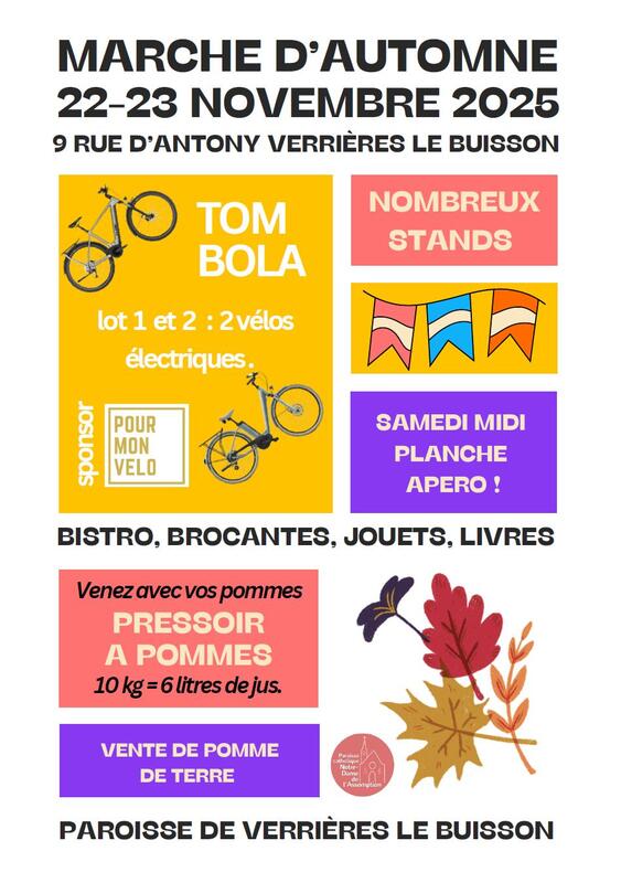 Le marché d'automne vous ouvre ses portes samedi 22 toute la journée et dimanche 23 novembre après-midi, au centre saint-andré : brocante, bistro, pressoir à pommes… jouets, livres… couronnes de l'avent et une planche apéro pour le déjeuner du samedi vous y attendent. En participant à la tombola, peut-être gagnerez-vous l’un des deux vélos électriques !