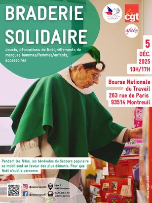 La fédération du secours populaire de seine-saint-denis a le plaisir d’être invitée par la bourse nationale du travail cgt pour un tenir une grande braderie solidaire au sein de son siège à montreuil. Le secours populaire sera présent dans le bâtiment, célèbre pour son architecture, le temps d’une journée.