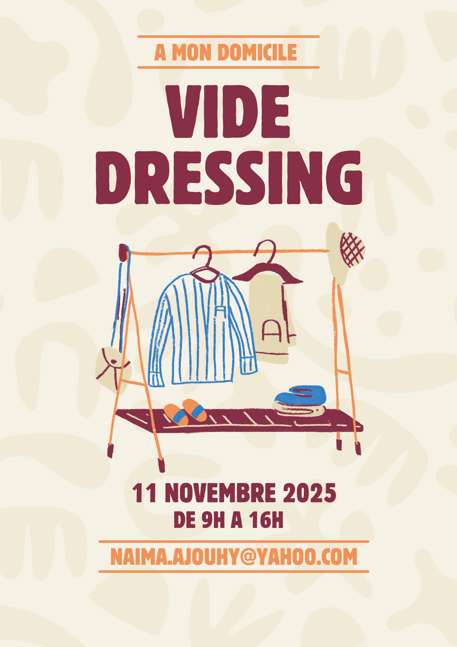 Bonjour à toutes et tous, je vous invite chaleureusement à venir chiner lors de mon vide dressing en plein air, organisé dans mon jardin. Au programme : des vêtements presque neufs (femme, bébé 1mois à 6mois) des chaussures en très bon état (de 36 à 38) des sacs, accessoires ️️et même de la vaisselle neuve jamais utilisée quand ? Le 11 novembre, de 9h à 16h où ? A mon domicile important : l’événement se déroule en extérieur dans le jardin. ️️merci de noter qu’il n’y aura pas d’accès aux wc pour des raisons d’hygiène. Si vous avez des questions ou souhaitez plus d’infos, n’hésitez pas à me contacter au plaisir de vous y retrouver pour un moment convivial et de belles trouvailles !