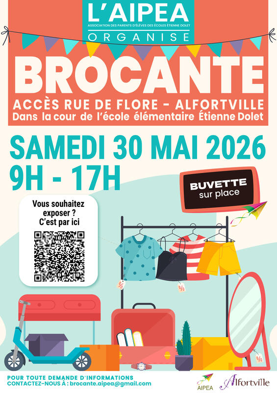 Information : https://www.helloasso.com/associations/aipea-association-independante-des-parents-d-eleves-d-alfortville/evenements/brocante-ecole-etienne-dolet-aipea-2026