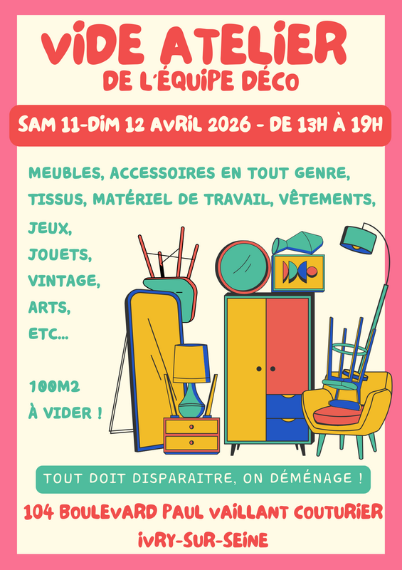 De 13h à 19h tout le week-end, nous organisons un grand vide-atelier en raison de notre futur déménagement.
