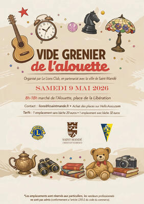 Achat d'emplacements sur helloasso : https://www.helloasso.com/associations/lions-club-de-saint-mande/evenements/vide-greniers-de-l-alouette-2026-a-saint-mande