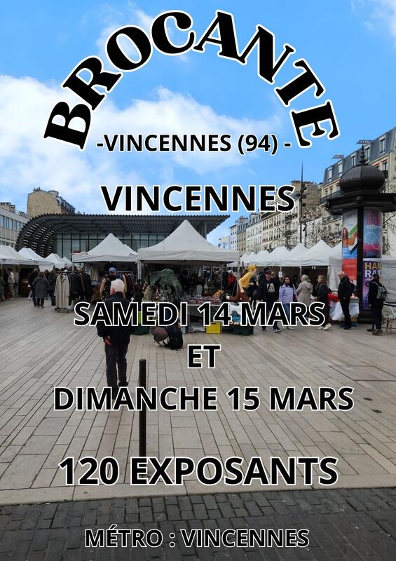 Informations exposants Type d'exposants Professionnels Horaires exposants 06h00 à 18h00 Tarif exposants Non communiqué Brocantes près de chez moi le Samedi 14 Mars 2026 Paris 14 Puces de la porte de vanves •••• 7 km 7 75014 - Brocante - Puces de la Porte de Vanves Paris 16 Brocante •• 7 km 75016 - Brocante - 209 avenue de Versailles Chatou Foire de chatou ••••• 23 km 78400 - Brocante - Ile des Impressionnistes Paris 14 Vide grenier - jean moulin ••• 7 km 75014 - Vide-Grenier - Alesia
