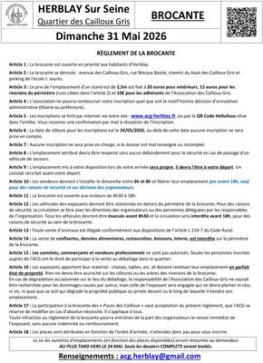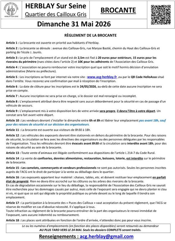 Quartier des cailloux gris à herblay sur seine (95220) : avenue des cailloux gris, chemin des hauts cailloux gris, rue maryse bastié et rue des écoles réservation obligatoire déballage en extérieur, mise à disposition de toilettes, animations, buvette, restauration sur place. Exposants en alimentaire refusés. Tarifs : non adhérents 20 €/2,50 m, riverains du périmètre 15€/2.50m & adhérents à l'acg: 10 €/2.50m ouverture aux exposants à 6h00 et fin à 18h00 ouverture aux visiteurs : de 08h30 à 18h00 informations : http://www.acg-herblay.fr -