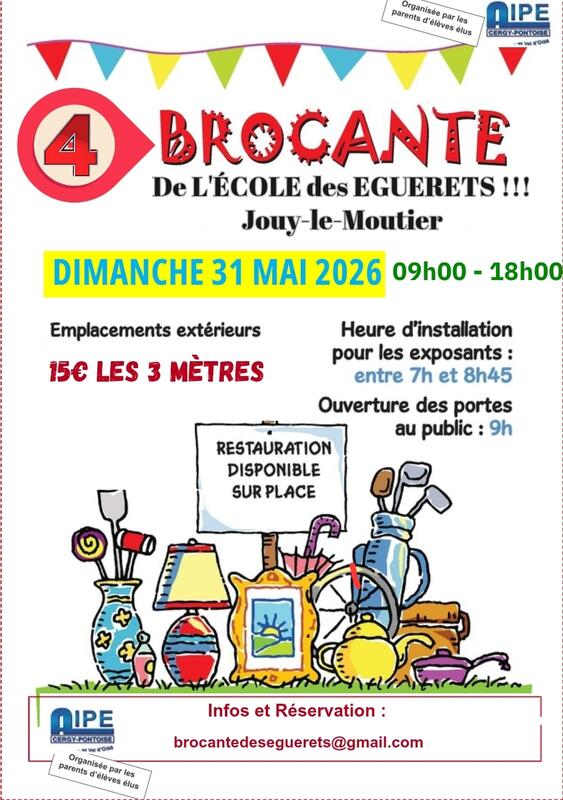 4 ème brocante de l’école des éguerets organisée par l'aipe (association parents d'élèves). Une partie des fonds sera reversée à l'école pour nos écoliers.