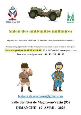 Bonjour, un rendez-vous pour les passionnés collectionneurs, reconstitueurs, et autre sur l'histoire si vous cherchez de la pièce 1ère ou 2ème guerre, résistance, indochine, algérie et autres conflits, pour vos véhicules également. Un passage obligatoire par magny en vexin le dimanche 19 avril 2026 un accueil vous sera réservé. Pour renseignements, voir l'adresse courriel. Magny en vexin situé entre cergy (95), les andelys et gisors (27), mantes (78). Accès rapide par la : D.14 / A.15 et D.983. Cordialement.