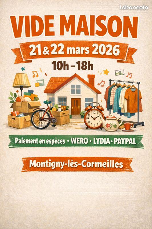 nous organisons un vide maison les samedi 21 et dimanche 22 mars 2026 de 10h à 18h.