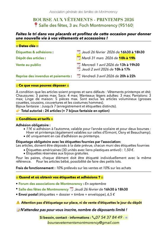 Lisez bien jusqu'au bout, car les horaires sont différents selon les dates. Grande bourse au vêtements, il ne s'agit pas d'une brocante, c'est un dépôt vente éphémère, vente par l'association d’accessoires, et de bijoux, au profit des particuliers qui déposent. Au printemps vente d'articles d'été.