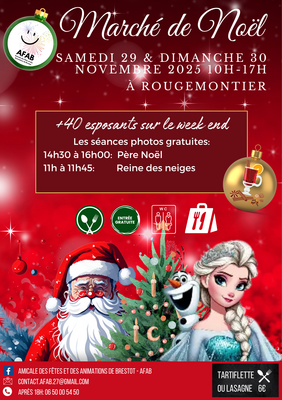 L'association afab (amicale des fêtes et des animations de brestot) vous propose son 3ème marché de noël samedi 29 et dimanche 30 novembre 2025 à la salle des fêtes de rougemontiers (+40 exposants)...