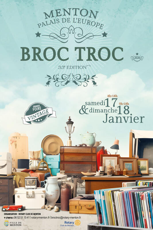 Cette brocante organisée par le Rotary Club de Menton depuis 1992 est devenue une manifestation incontournable au début de l’année si vous êtes dans le sud-est de la France. Avec près de 100 exposants et 11 000 visiteurs le Palais de l’Europe se transforme en vaste brocante. L'objectif est de collecter des fonds pour des projets Mentonnais.