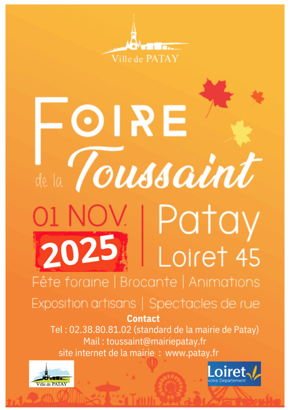 La mairie de Patay organise tous les ans la Foire de la Toussaint ! Lors de cette journée du 1er Novembre, venez retrouver les trésors de plus de 200 exposants professionnels et particuliers. Expositions artisanales, spectacles de rues et la fête foraine viennent également animer cette journée de chine !