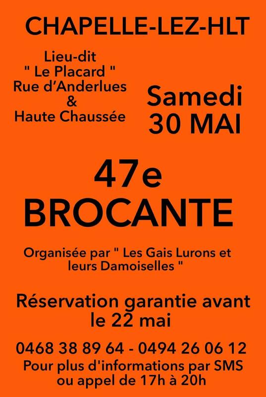 La 47e brocante vous donne rendez-vous le samedi 30 mai au lieu-dit « le placard », rue d’anderlues et haute chaussée.