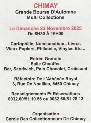Grande bourse d’automne toutes collections du “cercle des collectionneurs de chimay” réfectoire de l’athénée royal de chimay, rue de noailles,3 le dimanche 23 novembre 2025 de 8h30 à 16h00 cartes postales, livres, billets-monnaies, vieux papiers, timbres, vinyles, etc… nombres d’exposants + ou - 20 entrée gratuite buvette, sandwich /organisation cercle des collectionneurs de chimay