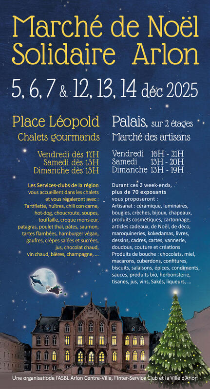 La magie de noël va envahir arlon avec le marché de noël solidaire sur la place léopold et dans le palais. Pour la 17ème année, la ville d'arlon, l'inter service club et l'asbl arlon centre-ville vous invitent à participer à 6 jours de festivités. Dans le palais, plus d'une septantaine d'exposants proposera des articles de cadeaux et des produits de bouche. Sur la place léopold, vous pourrez vous régaler dans les 10 chalets en bois tenus par les services-clubs de la région. Ces derniers remettront les bénéfices récoltés à des oeuvres caritatives de la région. L'an dernier, c'est la somme de 28 000€ qui a été reversé grâce à la générosité de tous les visiteurs.