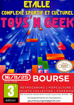 Toys'n geek 3ème édition , plongez dans l'univers des jouets rétro et geek ! Amateurs, nostalgiques ou fan des années 80-90 , la troisième bourse de collectionneurs organisée par le mini-foot de sainte-marie 87 revient pour votre plus grand plaisir. Date: 16/11/25 heure: 10h à 17h00 lieu: complexe sportif et culturel , 82a rue des ecoles b-6740 etalle rejoignez nous pour une expérience unique qui ravira les fans de toutes générations. Redécouvrez des trésors du passé et des , le tout dans une ambiance conviviale et passionnée. Ce que vous pourrez trouver : consoles et jeux vidéo rétro et actuels jouets de collection et objets vintage cartes à collectionner : pokémon, magic et bien plus articles de pop culture, comics et films ....Et d'autres surprises à venir que vous soyez un collectionneur chevronné ou simplement curieux, ce salon est l'endroit parfait pour trouver des trésors uniques et rencontrer d'autres passionnés. Ce sera l'endroit idéal pour un cadeau de fin d'année original. Cosplayers bienvenus ! Venez en costume et ajoutez encore plus de magie à cet événement ! Bar et petite restauration tout au long de la journée partagez cet événement avec vos amis, réservez la date et préparez-vous à vivre une journée découverte ou redécouverte à la toys'n geek 3 ! Entrée : 2€ pour toute question ou demande d'emplacement pour les exposants, veuillez nous contacter sur le messenger de cette page facebook ou à l'adresse mail . À bientôt ! Le comité et membres du mini-foot sainte-marie 87