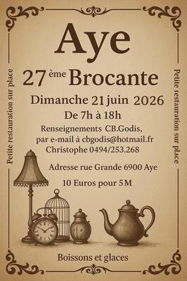 26ème brocante de aye le dimanche 15 juin 2025 de 7h à 18h ! Entrée gratuite 10€ l'emplacement de 5 mètres, possibilité de payer en liquide ou via payconiq. Prévente à 7€ mais il n’y a pas possibilité de réserve l’emplacement à l’avance (sauf riverain de la brocante). La vente de nourriture et de boissons est réservée à l’organisation. (sauf autorisation). Certains emplacements sont profonds vous pourrez y laisser votre voiture rendez-nous visite accompagnées du soleil renseignements au : 0494/253.268 pour christophe petite restauration sur place à disposition plus de 200 emplacements disponible.