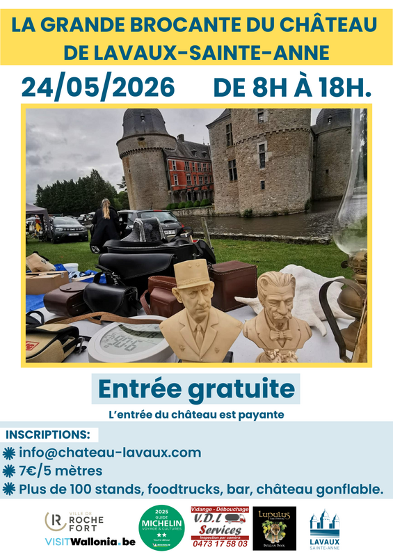 Dans le parc autour du château (dans une pâture). Accès gratuit sur tout le site (sauf à l’intérieur du château). Ouvert aux particuliers et professionnels (pas d’alimentaire, ni boisson) . Bar, tombola, château gonflable… nous avons énormément d’espace pour les brocanteurs : les inscriptions pour la grande brocante du château de lavaux-sainte-anne du dimanche 24 mai sont ouvertes ! Elle se tiendra comme chaque année dans notre magnifique parc à daims, au cœur du domaine du château lavaux sainte anne (préparez vos bottines : c’est une pâture, donc rosée du matin garantie ! ). 7€ pour 5 mètres (ne se réserve que par tranche de 5 mètres) petits rappels utiles : placement à l’arrivée (pas d’exception possible) pas de vente de boissons, notre bar est géré par l’équipe du château nous voulons une vraie brocante, pas de vente de neuf. Lisez notre règlement ! Des questions ? On est là pour vous répondre ! Ou en boutique à très bientôt pour une brocante conviviale et pleine de trouvailles !